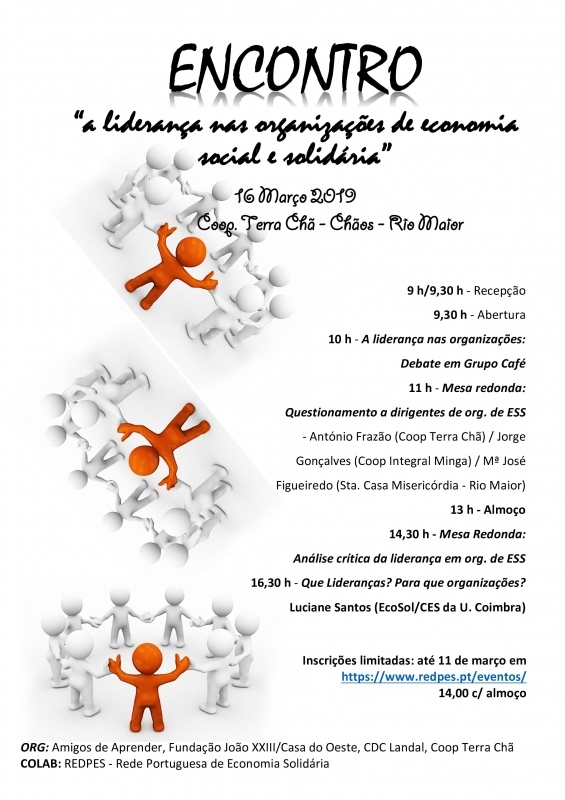 Em Chãos, no dia 16 de março, discutiremos a liderança nas organizações. Em maio, na Casa do Oeste será a vez de refletir a temática dos jovens e a economia social e solidária. Para setembro, no Landal, teremos como tema os trabalhadores nas organizações de economia social e solidária.