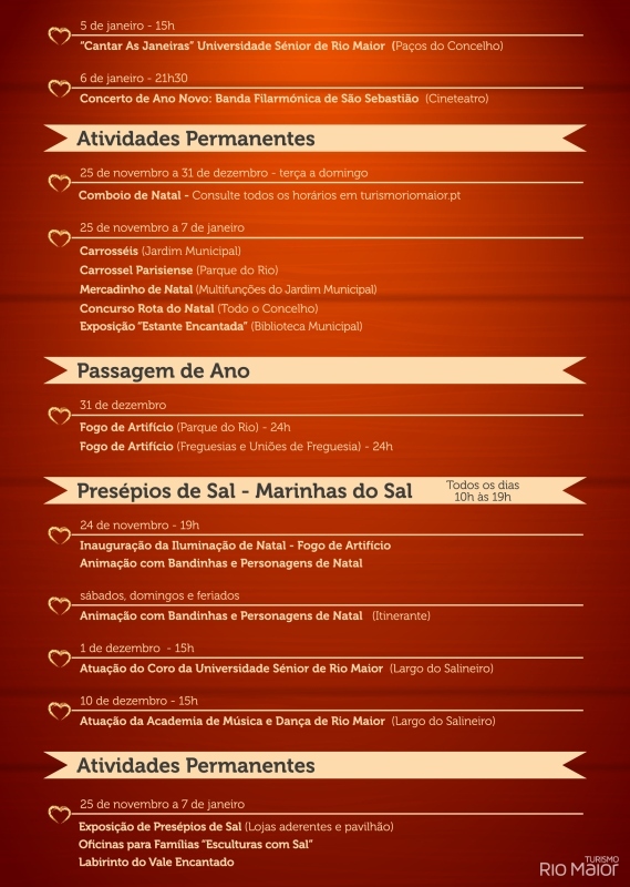 Poderá ainda usufruir do passeio no Comboio Turístico que liga a cidade de Rio Maior às Salinas, nas Marinhas do Sal, à semelhança dos últimos anos.