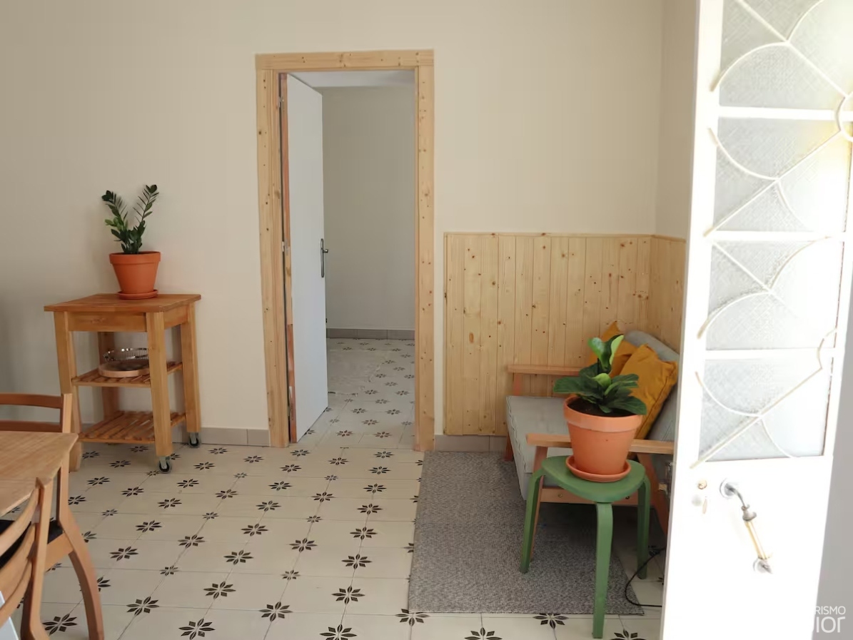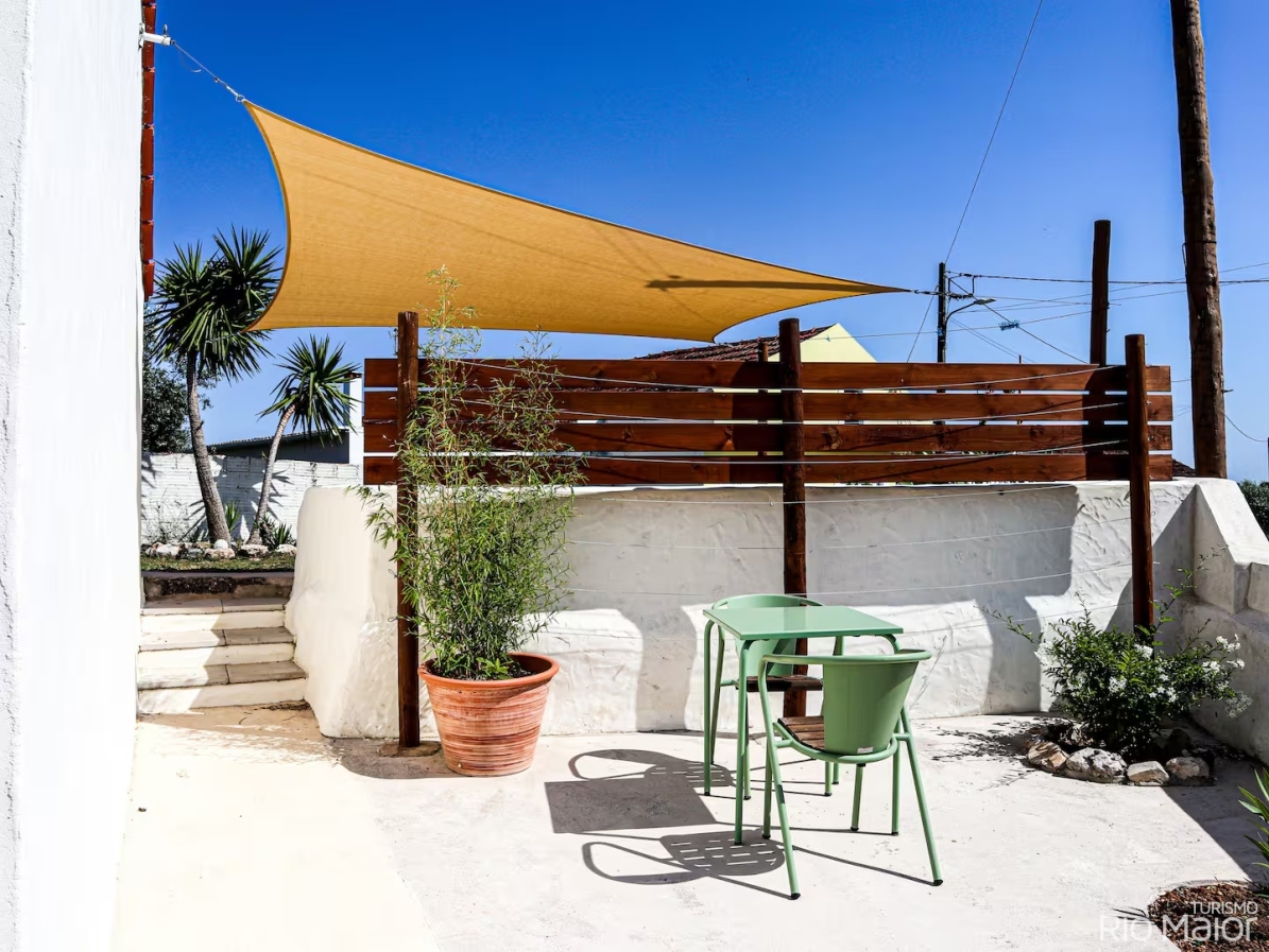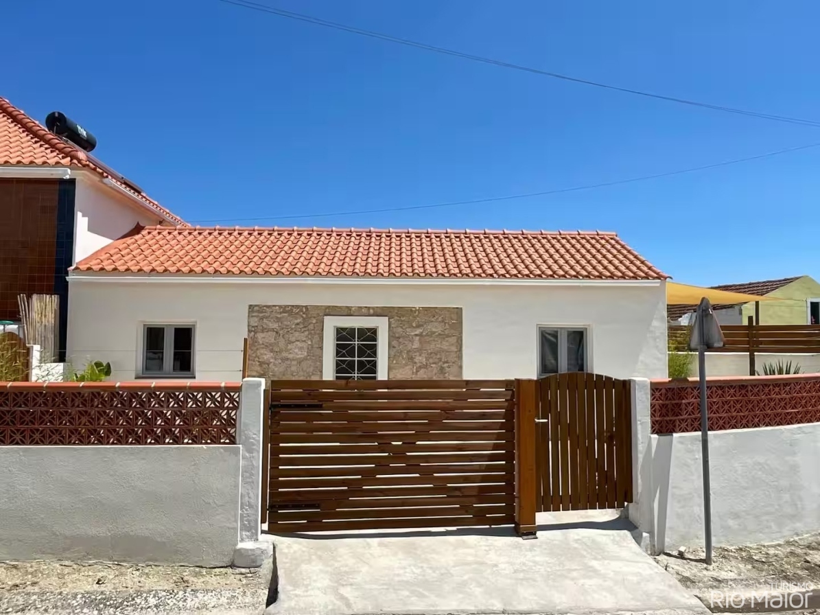 Casinha renovada, com dois quartos, pátio frontal e um jardim com terraço.