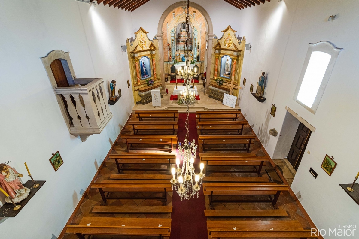 O interior é formado por uma nave única, um coro apoiado em colunas, um altar-mor e dois altares colaterais.