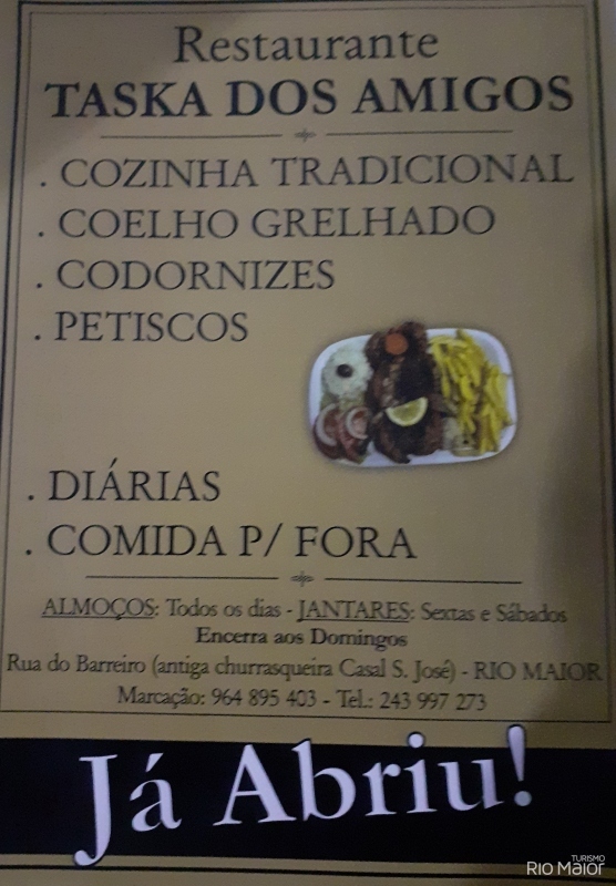 Especialidades: cozinha tradicional, coelho grelhado, codornizes, petiscos