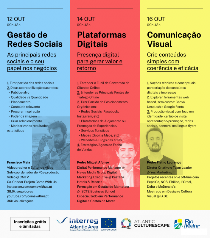 Deste modo, e com o objetivo de capacitar os nossos operadores turísticos para tirar o melhor partido possível das novas tecnologias e, assim, melhorar a atividade económica, os temas abordados nas seguintes sessões serão as "Plataformas Digitais", dia 14, com Pedro Miguel Afonso e a "Comunicação Visual", dia 16, com Pedro Fialho Lourenço.