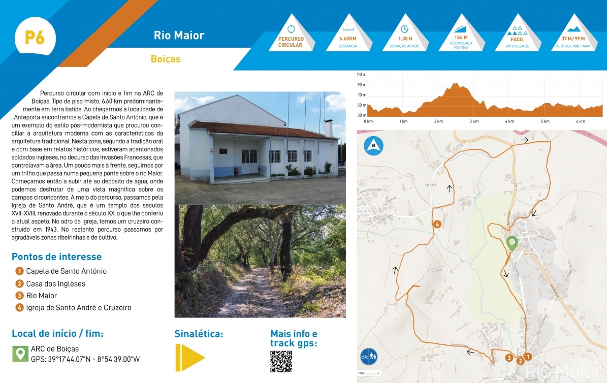 Percurso circular com início e fim na ARC de Boiças. Tipo de piso misto, 6.60 km predominantemente em terra batida. Ao chegarmos à localidade de Anteporta encontramos a Capela de Santo António, que é um exemplo do estilo pós-modernista que procurou conciliar