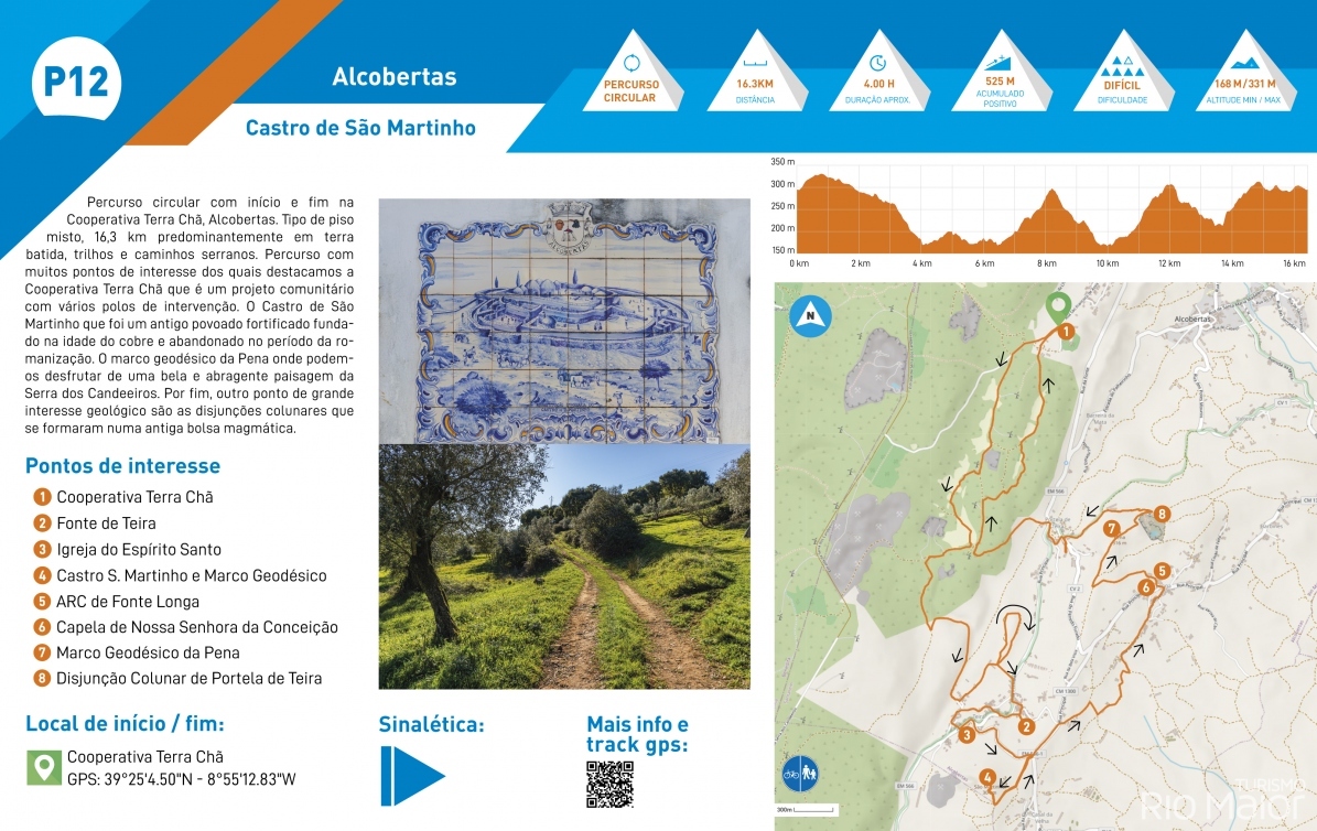 Percurso circular com início e fim na Cooperativa Terra Chã, Alcobertas. Tipo de piso misto, 16,3 km predominantemente em terra batida, trilhos e caminhos serranos. Percurso com muitos pontos de interesse dos quais destacamos a Cooperativa Terra Chã que é um projeto comunitário com vários polos de intervenção. O Castro de São Martinho que foi um antigo povoado fortificado fundado na idade do cobre e abandonado no período da romanização.