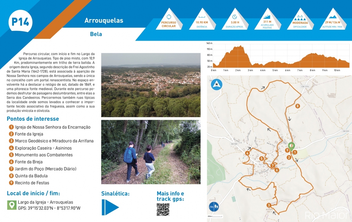 Percurso circular, com início e fim no Largo da Igreja de Arrouquelas. Tipo de piso misto, com 10,9Km, predominantemente em trilho de terra batida. A origem desta Igreja, segundo descrição de Frei Agostinho de Santa Maria (1642-1728), está associada à aparição de Nossa Senhora nos campos de Arrouquelas, sendo a única no concelho com um portal renascentista.