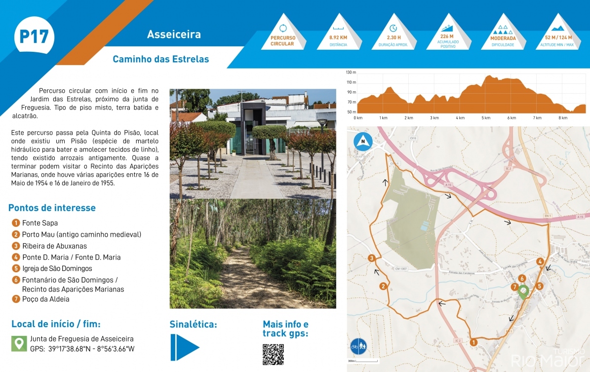 Percurso circular com início e fim no Jardim das Estrelas, próximo da junta de Freguesia de Asseiceira. Tipo de piso misto, terra batida e alcatrão.