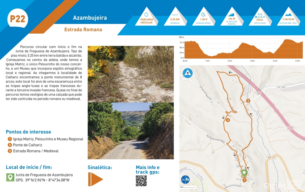 Percurso circular com início e fim na Junta de Freguesia de Azambujeira. Tipo de piso misto, 5.25 km entre terra batida e alcatrão. Começamos no centro da aldeia, onde temos a Igreja Matriz, o único Pelourinho do nosso concelho, e um Museu que incorpora espólio etnográfico local e regional. Ao chegarmos à localidade de Calhariz encontramos a ponte monumental de 8 arcos, este local foi alvo de uma escaramuça entre as tropas anglo-lusas e as tropas francesas durante a terceira invasão francesa. Quase no final do percurso temos vestígios de uma calçada que pode ter sido contruída no período romano ou medieval.