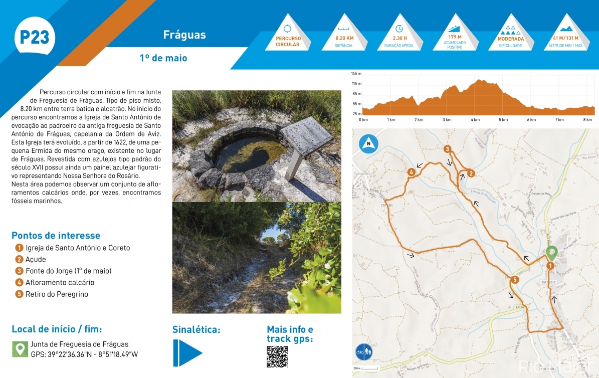 Percurso circular com início e fim na Junta de Freguesia de Fráguas. Tipo de piso misto, 8.20 km entre terra batida e alcatrão. No inicio do percurso encontramos a Igreja de Santo António de evocação ao padroeiro da antiga freguesia de Santo António de Fráguas, capelania da Ordem de Aviz.