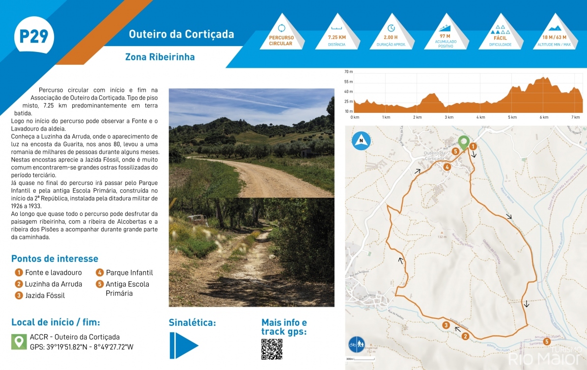Percurso circular com início e fim na Associação de Outeiro da Cortiçada. Tipo de piso misto, 7.25 km predominantemente em terra batida.