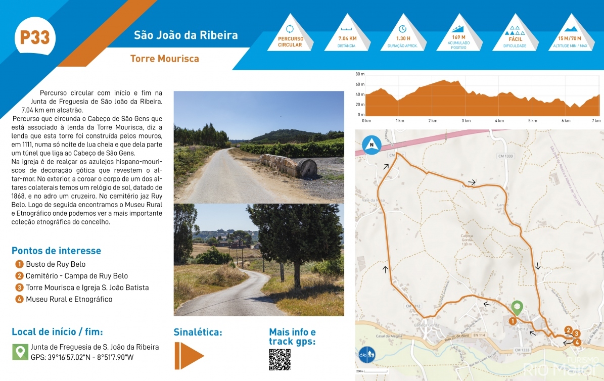 Percurso circular com início e fim na Junta de Freguesia de São João da Ribeira. 7.04 km em alcatrão.