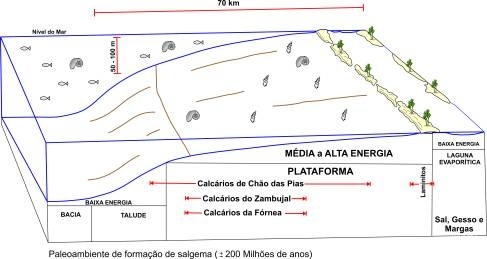 A sedimentação ocorria num ambiente de pouca profundidade, em lagunas e lagoas alimentadas por águas marinhas, dando lugar a alternâncias de argilas salgadas, sal-gema e gesso.